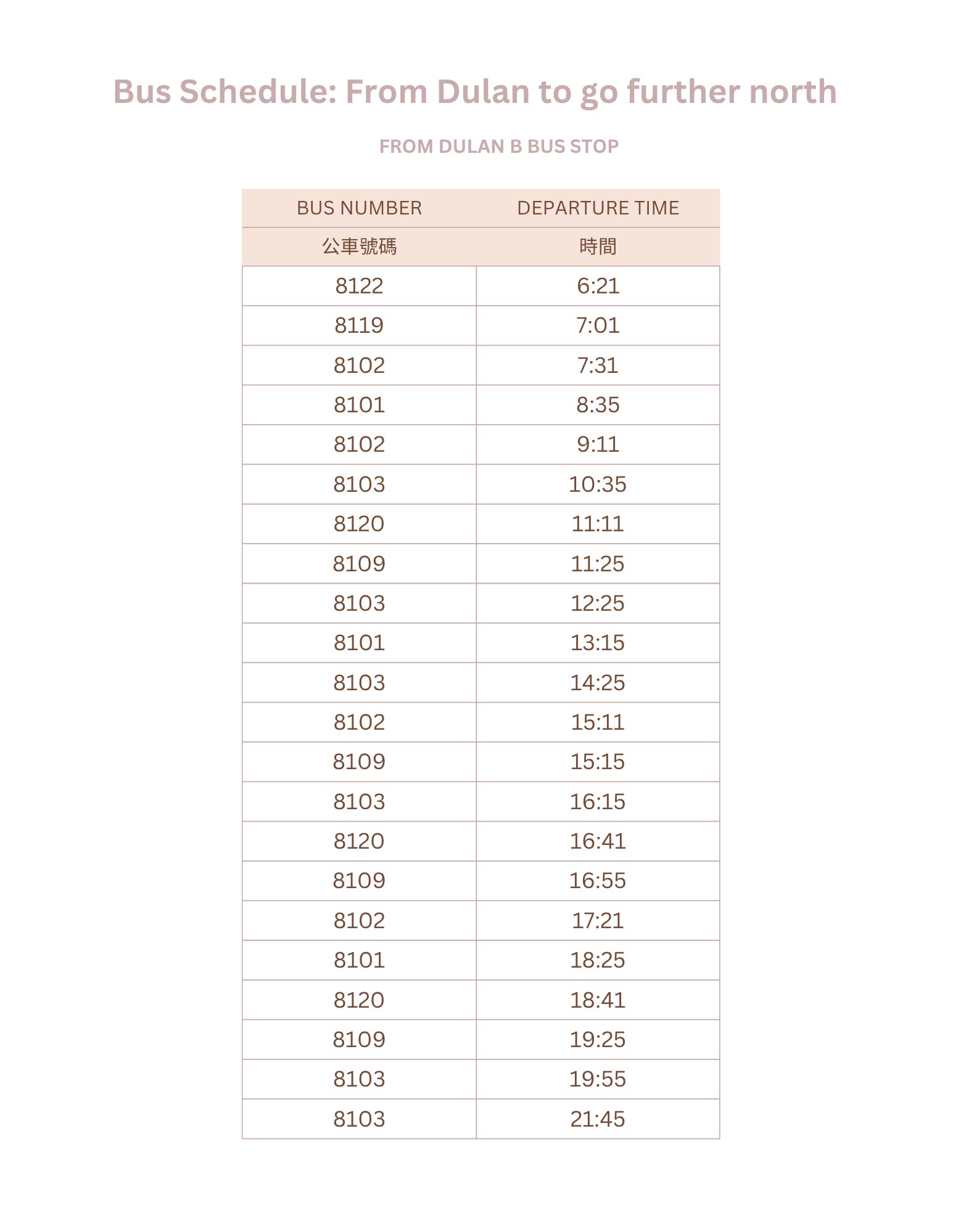 As of April 2026, the bus times are as follows (leaving Taitung station towards Dulan). You can take any of these buses: 8101, 8103, 8109, 8117.