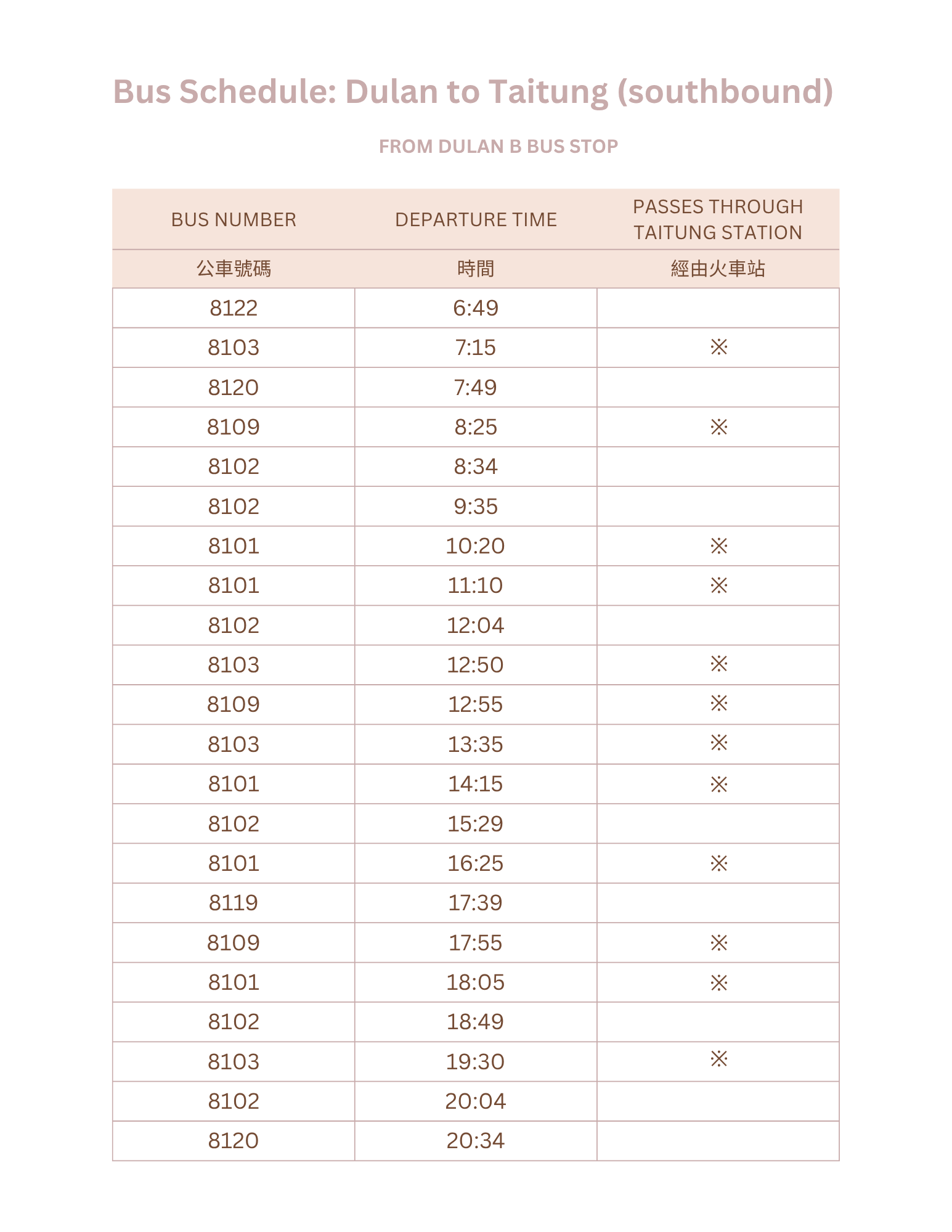Southbound bus schedule from Dulan B towards Taitung City