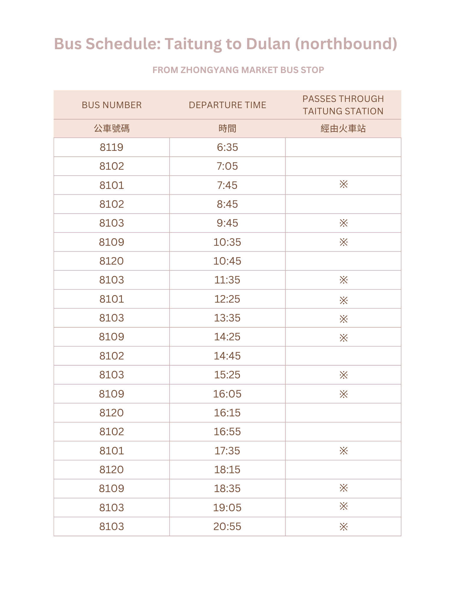 Northbound bus schedule from Taitung City (Zhongyang Market bus stop) towards Dulan