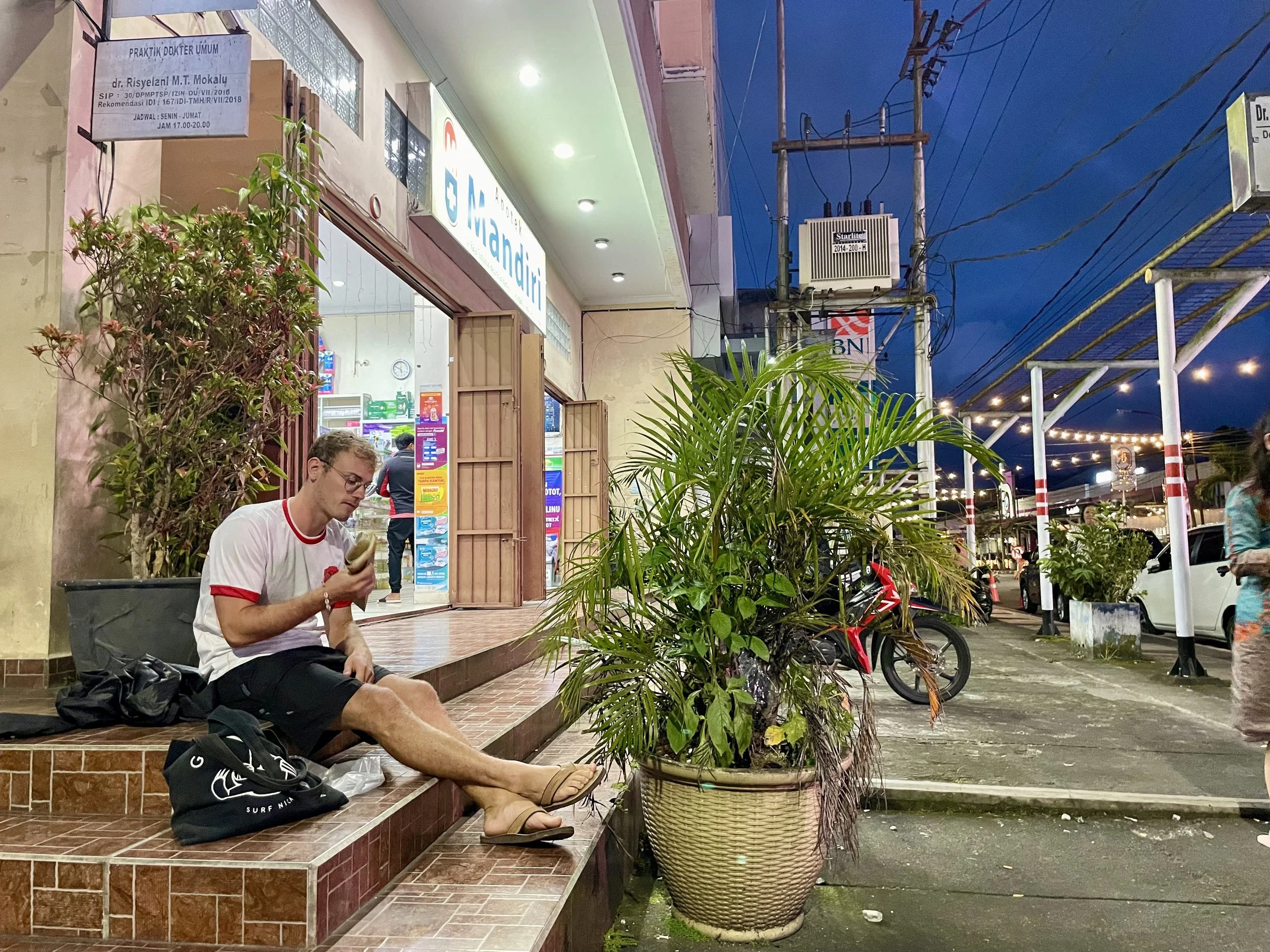 Public car – This is how we traveled. We made arrangements through our accommodation in Gorontolo for an overnight public car which left around 8pm and arrived around 6am. The cost was 350K per person ($22). The drivers in Indonesia drive extremely fast, and this was a fairly curvy, mountain road, making it impossible to sleep on the overnight drive. My boyfriend even tried tying his head to the headrest using his t-shirt! If you’re going overnight, I would highly not recommend this option, and instead take the bus for a much more comfortable ride.
